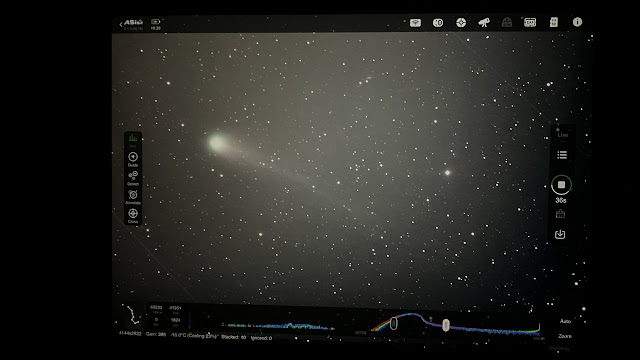 日が暮れると木星、シリウスが見えてくるようになります。今回の機材は赤道儀に搭載しているため、いかに早く極軸を合わせるかが勝負です。双眼鏡で北極星を探し出し、ようやく極軸望遠鏡で捕まえることができました。それから適当な視野を撮影し、ASIAIRのPlate Solvingで望遠鏡が向いている方向を検出し、SkySafari へ情報を手渡します。それから彗星が見える方向にGoToコマンドを送り、撮影を開始すると・・・・